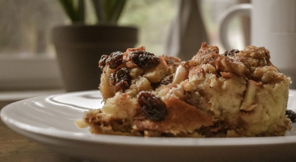 - Ρίχνετε στο μείγμα το ψωμί και τις σταφίδες και ανακατεύετε να μουλιάσουν εντελώς.