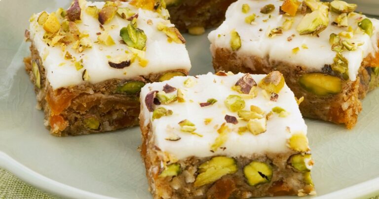 - Αδειάζετε το μείγμα στη φόρμα και το πιέζετε με μια σπάτουλα να ισιώσει. Ψήνετε το γλυκό για 30' - 35'. Αφήνετε να κρυώσει μέσα στη φόρμα, ξεφορμάρετε και πασπαλίζετε με άχνη ζάχαρη ή αλείφετε με λευκό γλάσο και πασπαλίζετε με φιστίκια.