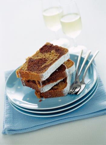 - Απλώνετε τη μισή (κίτρινη) ζύμη του κέικ , από πάνω βάζετε τη ζύμη με το κακάο και ύστερα από πάνω απλώνετε την υπόλοιπη κίτρινη ζύμη. Προσεκτικά βυθίζετε στις φόρμες ένα ξυλάκι και το κουνάτε μέσα στη ζύμη των κέικ για να τα κάνετε δίχρωμα. Ψήνετε τα κέικ στους 180° C μια ώρα ή ανάλογα με το φούρνο σας .