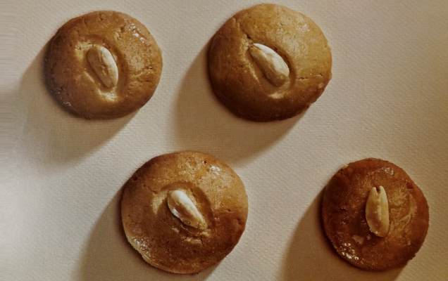 - Πλάθετε τη ζύμη σε 60-70 στρογγυλά μπαλάκια και τοποθετείτε σε κάθε μπαλάκι από μισό αμύγδαλο. Πατάτε λίγο τους κουραμπιέδες με την παλάμη σας και τους τοποθετείτε σε ταψί χωρίς να το βουτυρώσετε.