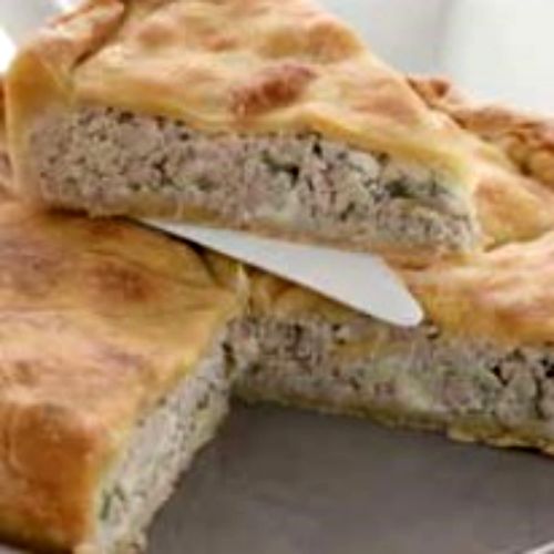 - Χωρίζουμε τη ζύμη στη μέση και ανοίγουμε 2 φύλλα. Στρώνουμε το ένα σ’ ένα ταψί που έχουμε αλείψει ελαφρά με λίγο βούτυρο. Ρίχνουμε από πάνω τη γέμιση και καλύπτουμε με το δεύτερο φύλλο. Αλείφουμε με το υπόλοιπο βούτυρο και ψήνουμε για 45΄ περίπου ή μέχρι να ροδίσει.