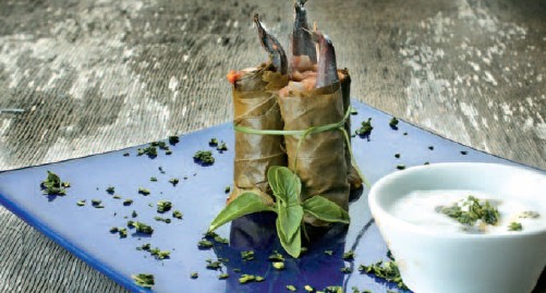 - Παίρνετε ένα φύλλο και το βάζετε στον πάγκο μας. Τοποθετείτε λίγο από το ραγού καραβίδας και ένα γαύρο. Τυλίγετε σφιχτά και συνεχίζετε κατά τον ίδιο τρόπο μέχρι να τελειώσουν όλα τα φύλλα. Σερβίρετε τα ντολμαδάκια σε 4 πιάτα και γαρνίρετε με λίγο στραγγιστό γιαούρτι. Ραντίζετε με λίγο ελαιόλαδο.