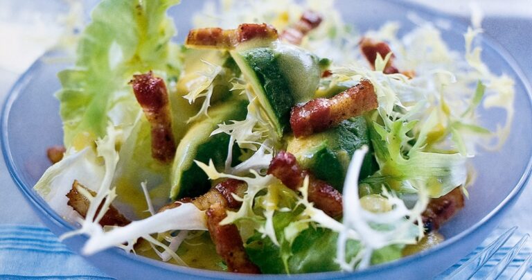 Συνταγή για πράσινη σαλάτα ανάμεικτη με μπείκον και αβοκάντο