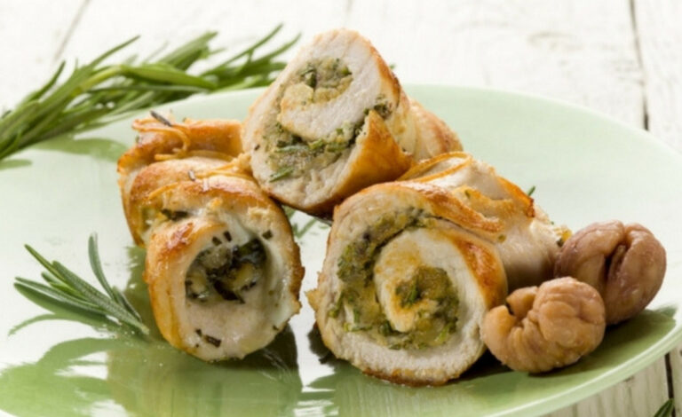 - Ζεσταίνετε το υπόλοιπο λάδι και ροδίζετε τα ρολά πολύ καλά από όλες τις πλευρές. Τα βάζετε σε ταψάκι και περιχύνετε με το υπόλοιπο κρασί και 1 φλιτζάνι ζεστό νερό μέσα στο οποίο διαλύετε τον κύβο λαχανικών. Ψήνετε το φαγητό στους 200 °C για 1 ώρα και 15’, σκεπασμένο με αλουμινόχαρτο. Σερβίρετε τα ρολά κομμένα σε φέτες. Συνοδεύετε με ζυμαρικά ή ρύζι ή γαρνίρετε με βρασμένα κάστανα.