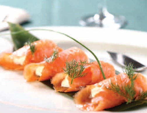- Σε επίπεδη επιφάνεια απλώνετε τα φιλέτα σολομού και βάζετε στη μια άκρη τους από μια γεμάτη κουταλιά από το μείγμα με την καβουρόψιχα. Τυλίγετε σε ρολά. Αφήνετε τα ρολά στο ψυγείο για 3-4 ώρες και τα σερβίρετε αφού γαρνίρετε με φυλλαράκια άνηθου. Συνοδεύετε, αν θέλετε, με φρυγανισμένο ψωμί ή με μπλίνις.