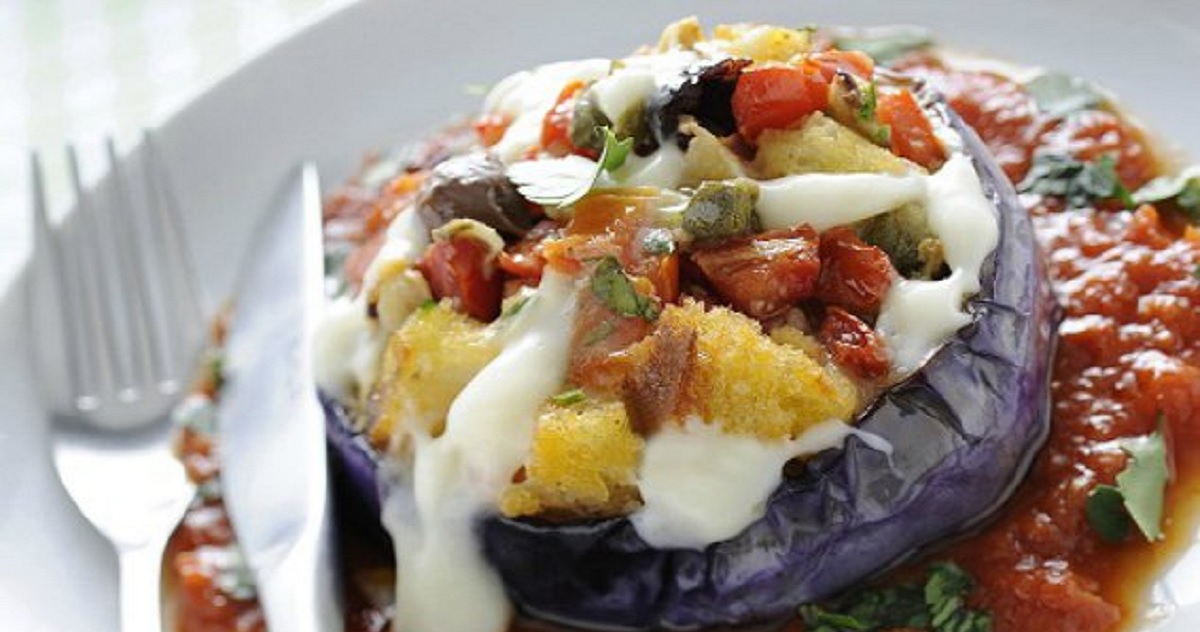 ΥΛΙΚΑ ΓΙΑ 6 ΑΤΟΜΑ • 6 μεγάλες μελιτζάνες φλάσκες • 200 γρ. κασέρι τριμμένο • 200 γρ. κεφαλογραβιέρα κομμένη σε κυβάκια • 2/3 του φλιτζανιού του τσαγιού ελαιόλαδο • 2 λιαστές ντομάτες ψιλοκομμένες • 200 γρ. ψωμί σε κύβους • 1 κρεμμύδι ψιλοκομμένο • 3 σκελίδες σκόρδου ψιλοκομμένες • 2-3 κουταλιές της σούπας μαϊντανός ψιλοκομμένος • 2-3 κουταλιές της σούπας κάππαρη ξαλμυρισμένη • 2 φλιτζάνια του τσαγιού έτοιμη ή σπιτική σάλτσα ντομάτας • 2 ώριμες ντομάτες σφιχτές • αλάτι, πιπέρι φρεσκοτριμμένο • λίγη ζάχαρη (προαιρετικά)