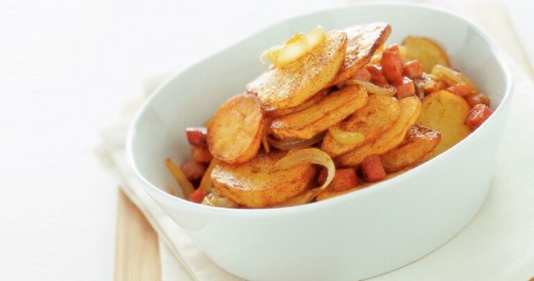 Τη συνταγή αυτή μπορείτε να τη φτιάξετε τόσο με Λουκάνικα Φρανκφούρτης όσο και με καπνιστό μπέικον. Τηγανισμένες με ένα από τα δύο αλλαντικά και με κρεμμύδι, οι πατάτες μετατρέπονται σε μεζέ ολκής για κρασί και για μπίρα.