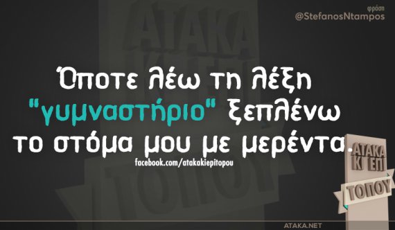 Blogs Mood For Fun: Όποτε λέω τη λέξη γυμναστήριο…. ICookGreek Team - 28 Σεπτεμβρίου, 2015 0 Facebook Twitter Viber Messenger WhatsApp Email ΠΗΓΗ: ataka.net