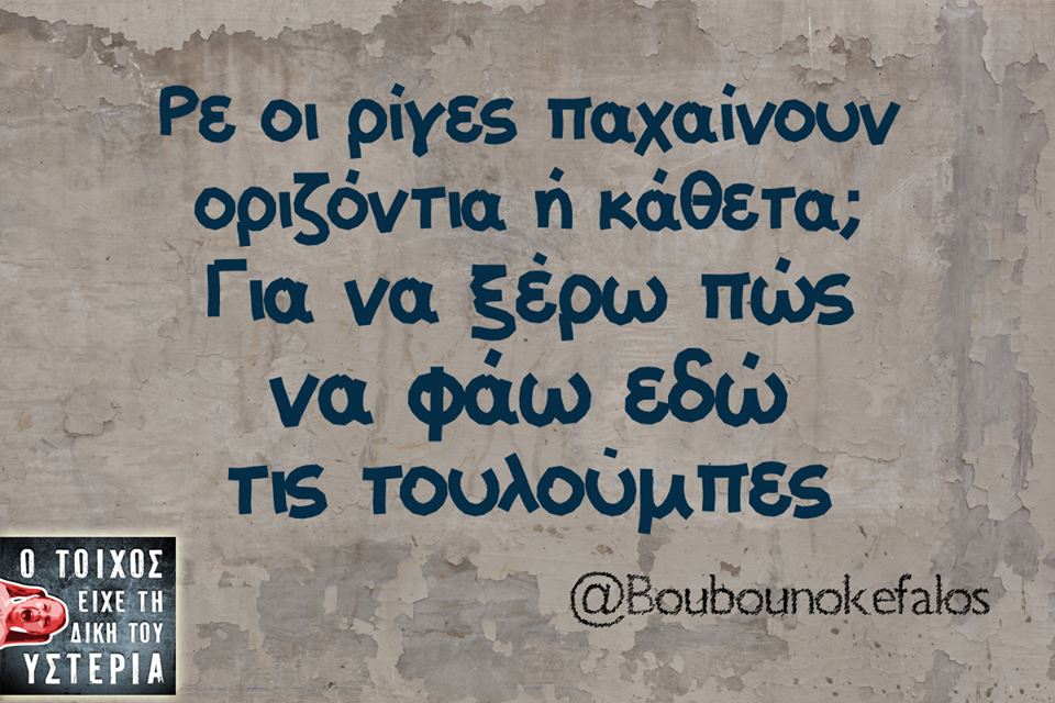 Blogs Mood for Fun: Τουλούμπες ICookGreek Team - 27 Μαρτίου, 2014 0 Facebook Twitter Viber Messenger WhatsApp Email Snapshots που αποτυπώνουν σκέψεις της στιγμής. ΠΗΓΗ: Ο Τοίχος είχε τη Δική του Υστερία