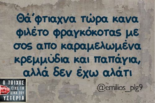 Blogs Mood of the Moment 11 ICookGreek Team - 26 Φεβρουαρίου, 2014 0 Facebook Twitter Viber Messenger WhatsApp Email Snapshots που αποτυπώνουν διαθέσεις της στιγμής. ΠΗΓΗ:Ο τοίχος είχε τη δική του…υστερία