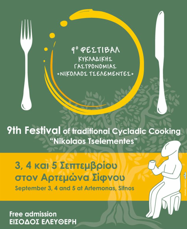 Το Φεστιβάλ Κυκλαδικής Γαστρονομίας «Νικόλαος Τσελεμεντές» για ένατη χρονιά φέτος, περιμένει όσους αγαπούν τις παραδοσιακές ελληνικές γεύσεις και τις νησιωτικές γιορτές. Στις 3, 4 και 5 Σεπτεμβρίου, με κέντρο τον Αρτεμώνα της Σίφνου και δράσεις σε όλο το νησί, ο Πολιτιστικός Σύλλογος Σίφνου και οι συνδιοργανωτές, Περιφέρεια Νοτίου Αιγαίου και Δήμος Σίφνου με τη συνεργασία τοπικών φορέων και Συλλόγων, καλούν όλα τα νησιά των Κυκλάδων και, από φέτος, αντιπροσωπείες από όλα τα γεωγραφικά διαμερίσματα της χώρας, για να μαγειρέψουν και να συμμετάσχουν σε μια μεγάλη γιορτή για μικρούς και μεγάλους, ντόπιους και επισκέπτες, νησιώτες και στεριανούς.