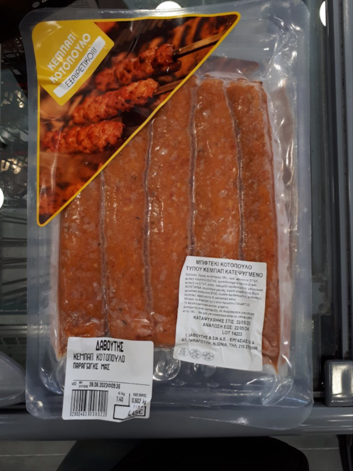 Ο ΕΦΕΤ και ειδικότερα η Περιφερειακή Διεύθυνση Αττικής, κατά τη διενέργεια ελέγχων στο πλαίσιο του Προγράμματος «Επίσημος Έλεγχος Μικροβιολογικών Κριτηρίων Ασφάλειας Τροφίμων» έτους 2023, προέβη σε δειγματοληψία, στην επιχείρηση «ΚΡΕΑΤΑ ΠΟΙΟΤΗΤΟΣ ΔΑΒΟΥΤΗΣ ΑΕ» στην οδό Εργασίας 15 & Παναγούλη, στην Νέα Ιωνία Αττικής του προϊόντος: «Κεμπάπ κοτόπουλο-Μπιφτέκι κοτόπουλο (τύπου κεμπάπ) κατεψυγμένο» βάρος: 600 g, αριθ. παρτίδας: L 14223, ημ. ανάλωσης έως: 22.05.2024.