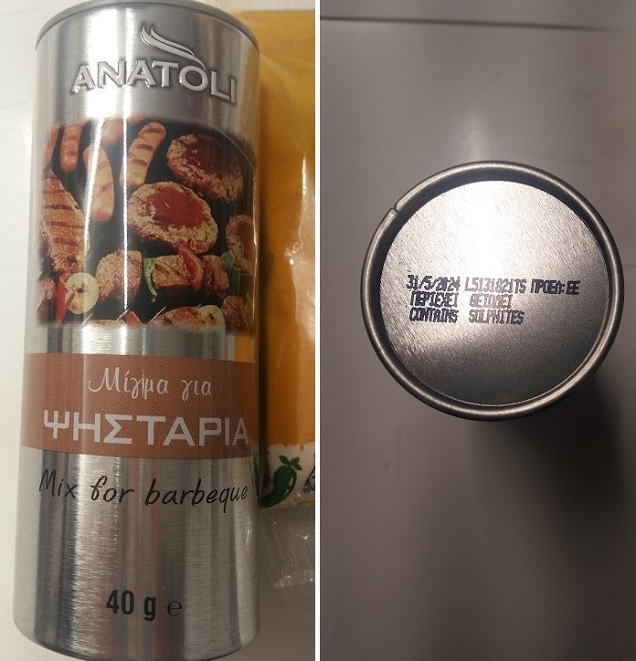 Ο ΕΦΕΤ και ειδικότερα η Περιφερειακή Διεύθυνση Κεντρικής Μακεδονίας, κατά τη διενέργεια ελέγχων στο πλαίσιο του Προγράμματος «Επίσημος Έλεγχος για την παρουσία αλλεργιογόνων ουσιών σε ορισμένα είδη τροφίμων» έτους 2021, προέβη σε δειγματοληψία τροφίμου με στοιχεία: «ΜΙΓΜΑ ΓΙΑ ΨΗΣΤΑΡΙΑ- MIX FOR BARBEQUE» με την επωνυμία ANATOLI , με ημερομηνία ανάλωσης κατά προτίμηση 31/5/2024 και αριθμό παρτίδας LOT 5131821TS προέλευσης Ε.Ε. σε μεταλλικό περιέκτη των 40 γραμμαρίων, που συσκευάζεται και διανέμεται στην Ελλάδα από την ΑΝΑΤΟΛΗ ΜΠΑΧΑΡΙΚΑ Α.Β.Ε.Ε., με έδρα την Μεταμόρφωση Αττικής, οδός Ρ. Φεραίου 32 και Ψυχάρη.