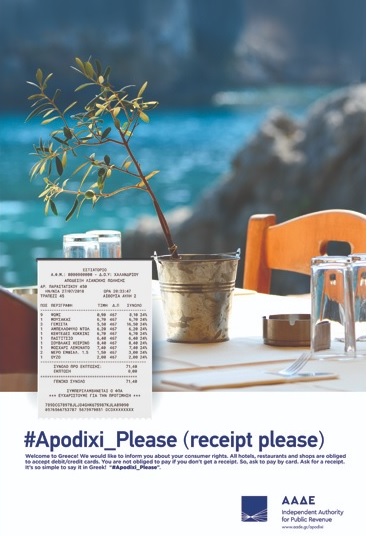 Εξάλλου, στις αφίσες που θα τοποθετηθούν στα αεροδρόμια, κάτω από μια ωραία φωτογραφία ενός τραπεζιού εστιατορίου – δίπλα στη θάλασσα, θα υπάρχει η εικόνα μιας νόμιμης απόδειξης, συνοδευόμενη από το εξής κείμενο (στα αγγλικά): «#Apodixi_Please (απόδειξη παρακαλώ). Καλώς ήλθατε στην Ελλάδα. Θα θέλαμε να σας ενημερώσουμε για τα καταναλωτικά δικαιώματά σας. Όλα τα ξενοδοχεία, εστιατόρια και καταστήματα υποχρεούνται να δέχονται χρεωστικές/πιστωτικές κάρτες. Δεν υποχρεούστε να πληρώσετε εάν δεν λάβετε απόδειξη. Γι’ αυτό, ζητήστε να πληρώσετε με κάρτα. Ζητήστε απόδειξη. Είναι τόσο απλό να το πείτε ελληνικά: #Apodixi_Please».