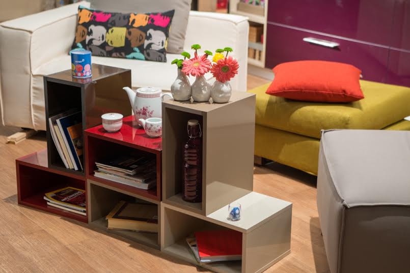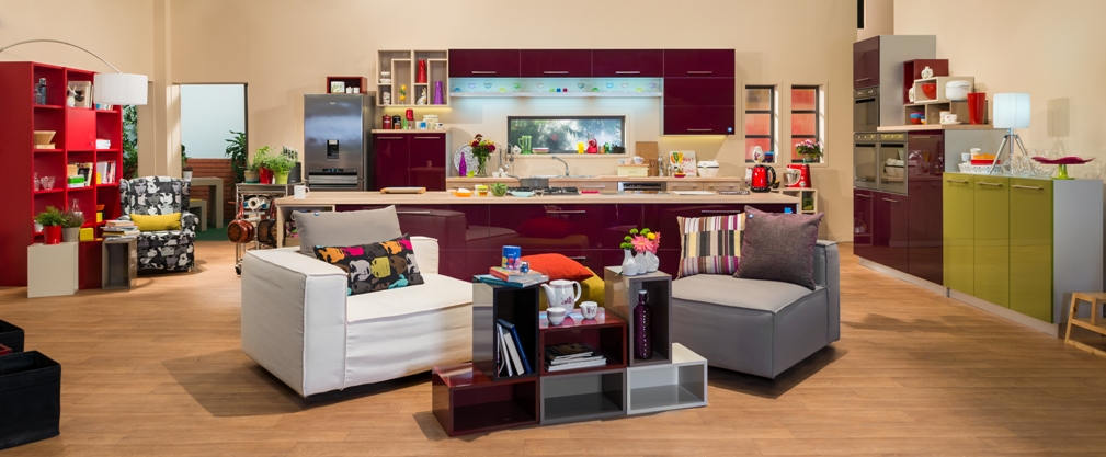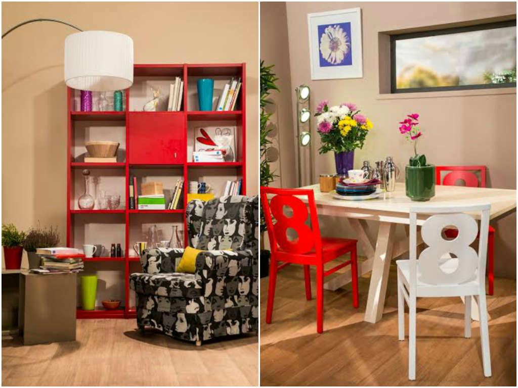 Αποχρώσεις σε βιολετί gloss και καπουτσίνο ματ συνδυασμένες με χρώματα φυσικού ξύλου, διαλέχτηκαν για να δώσουν αίσθηση άνεσης, ζεστασιάς και χαλάρωσης. Η ξύλινη τραπεζαρία Wood (δρυς σε ανοιχτό τόνο) και οι καρέκλες τραπεζαρίας Roy σε λευκό και κόκκινο χρώμα θα προσθέτουν την παιχνιδιάρικη νότα στο χώρο. Το σύστημα καναπέ Puzzle, που τα κομμάτια του προσαρμόζονται σαν παζλ ανάλογα με τις περιστάσεις, στη σκηνή της Ελένης διαμορφώθηκε με βάση τις στουντιακές ανάγκες. Γουστόζικη αντίθεση στο χώρο δημιουργεί η βιβλιοθήκη της σειράς basic σε κόκκινο χρώμα και η πολυθρόνα Romance.