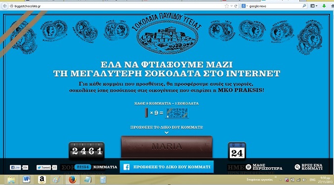 Διαδικτυακή φιλανθρωπική δράση «τρέχει» αυτή την περίοδο η σοκολάτα Υγείας Παυλίδης, σε συνεργασία με τη ΜΚΟ Praksis. Όσο πιο μεγάλη on-line σοκολάτα φτιαχτεί τόσο περισσότερες σοκολάτες θα χαρίσει σε οικογένειες που στηρίζει η Praksis.