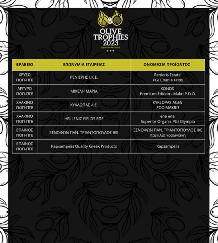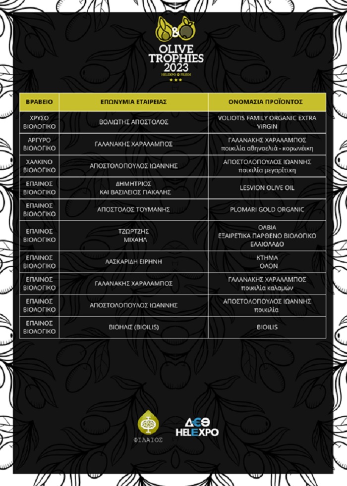 Την τεράστια παλέτα αρμονίας της γεύσης των διαφορετικών ποικιλιών ελαιολάδου και επιτραπέζιας ελιάς ανέδειξε ο Διαγωνισμός OLIVE TROPHIES 2023, τον οποίο διοργανώνει η HELEXPO και υπογράφει με το κύρος της για την ακεραιότητα των αποτελεσμάτων η Λέσχη Φίλων Ελαιολάδου και Ελιάς ΦΙΛΑΙΟΣ.