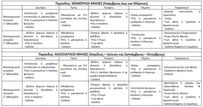 Κρέας, κοτόπουλο, ψάρι, αλλά και όσπρια, ζυμαρικά, λαχανικά φρούτα θα περιλαμβάνονται στα σχολικά γεύματα του τρέχοντος έτους, που χωρίζονται σε δύο περιόδους, σύμφωνα με τη σχετική ανακοίνωση του υπουργείου, η οποία δίνει μια γεύση στον παρακάτω πίνακα.