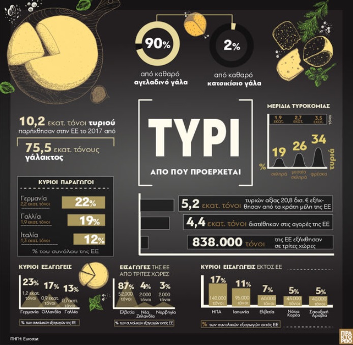 Το 2017 παρήχθησαν στην ΕΕ 10,2 εκατ. τόνοι τυριού από 75,5 εκατ. τόνους γάλακτος, βάσει των στοιχείων της Eurostat.