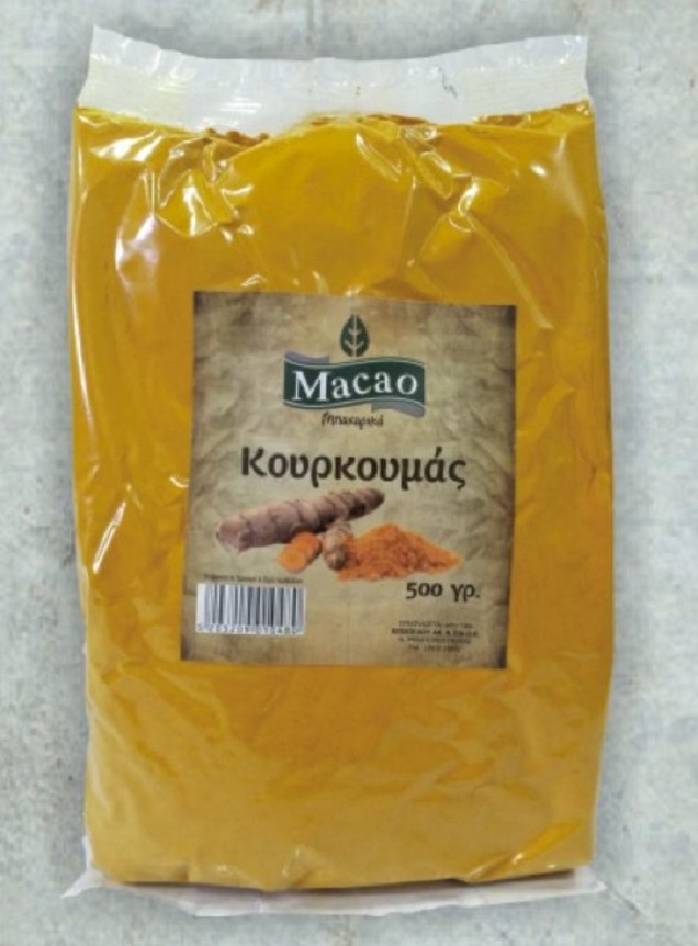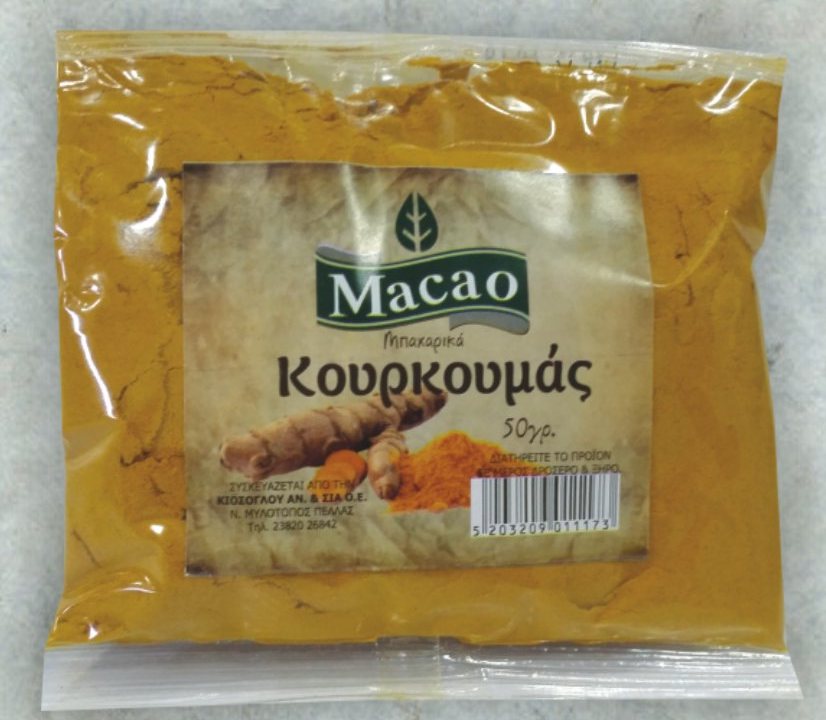Ο Ε.Φ.Ε.Τ. και ειδικότερα η Περιφερειακή Διεύθυνση Κεντρικής Μακεδονίας στο πλαίσιο του συντονισμένου από την Ευρωπαϊκή επιτροπή προγράμματος για την γνησιότητα/ αυθεντικότητα των μπαχαρικών/αρτυμάτων, προέβη σε δειγματοληψία κουρκουμά, με την εμπορική ονομασία “Macao/Κουρκουμάς”, των 50 γραμμαρίων, με στοιχεία: L1901, ανάλωση κατά προτίμηση 12/2021, προέλευσης Ινδίας, που εισάγεται μέσω Βουλγαρίας και συσκευάζεται από την εταιρεία “Κιοσόγλου Αντώνιος και Σια Ο.Ε– MAKAO”.