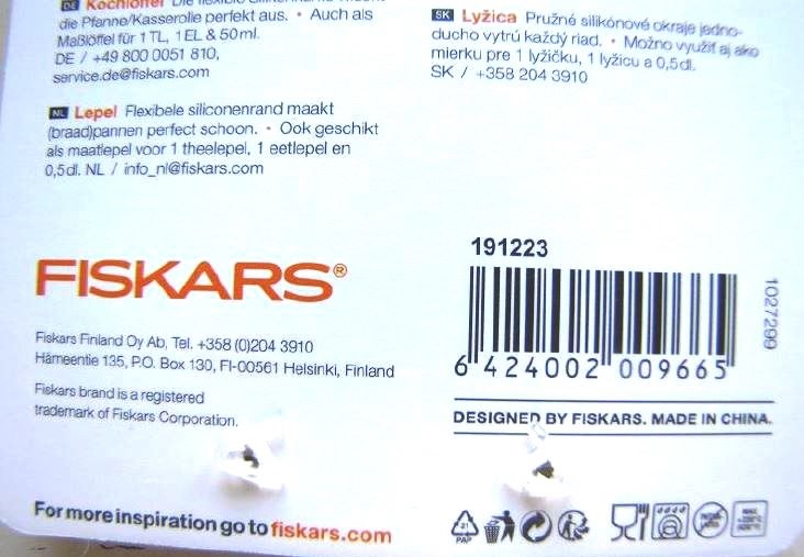 Πρόκειται για πλαστική κουτάλα μαύρου χρώματος, με εμπορική ονομασία FISKARS, προέλευσης Κίνας, με κωδικό προϊόντος 1027299 και αριθμό παρτίδας 191223.