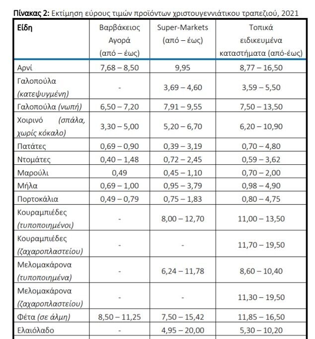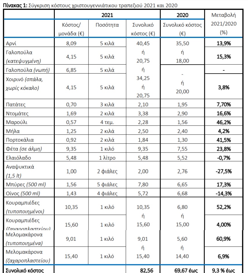 «Η εκτίμηση του κόστους για το φετινό χριστουγεννιάτικο τραπέζι (6-8 ατόμων) κυμαίνεται από 82,56 έως 113,90 ευρώ. Πρόκειται για μεταβολή της τάξης του 9,3 % έως 18,5 % σε σύγκριση με το αντίστοιχο τραπέζι του 2020. Υπενθυμίζουμε ότι η αγορά των Χριστουγέννων 2020 λειτούργησε υπό καθεστώς lock down».