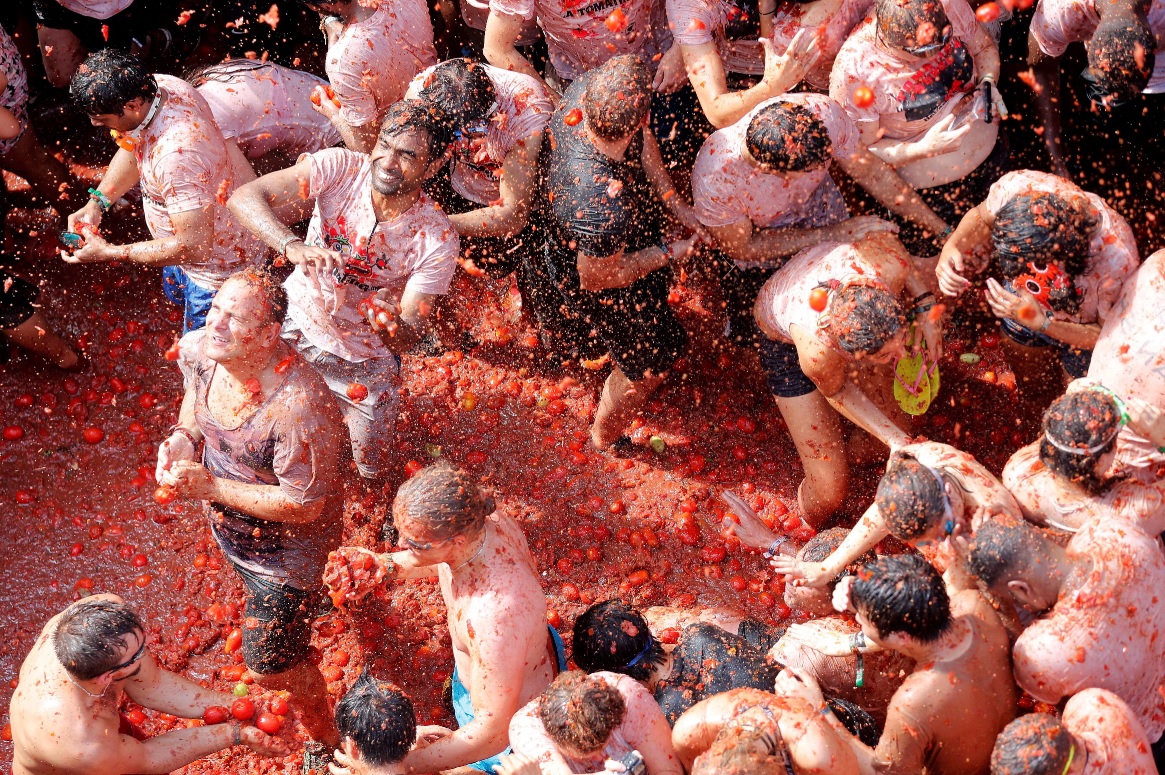 Χιλιάδες γλεντζέδες εκσφενδόνισαν 145 τόνους τομάτες αναμεταξύ τους σήμερα, γιορτάζοντας το ετήσιο φεστιβάλ Tomatina στην πόλη Μπουνιόλ της επαρχίας Βαλένθια στην ανατολική Ισπανία.