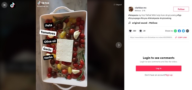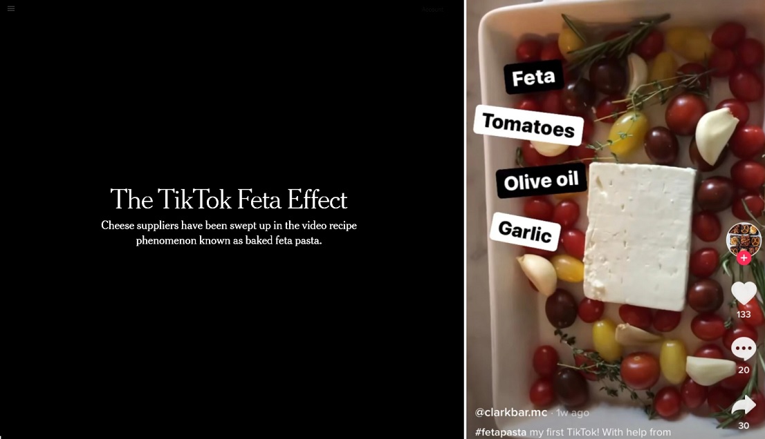 Η καλή αρχή για το 2021 έγινε μέσω TikTok, εφαρμογής για βίντεο με μεγάλη πέραση σε νεαρόκοσμο. Εκεί πρωτοδημοσιεύτηκε συνταγή-βίντεο με ζυμαρικά φούρνου, ένα ολόκληρο κομμάτι φέτα, σκόρδο και ντοματίνια. Η πάναπλη συνταγή με την πλούσια, κρεμώδη σάλτσα σάλτσα άρχισε να αναπαράγεται κατά κόρον.