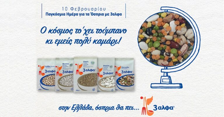 Με αφορμή την Παγκόσμια Ημέρα για τα Όσπρια που έχει ανακηρυχτεί η 10η Φεβρουαρίου από τον Οργανισμό Τροφίμων και Γεωργίας (FAO) του ΟΗΕ, η 3αλφα, που πρωταγωνιστεί πάνω από μισό αιώνα στην επεξεργασία και την συσκευασία οσπρίων, κηρύσσει τον μήνα Φεβρουάριο ως μήνα των οσπρίων και τον γιορτάζει τον δικό της τρόπο.