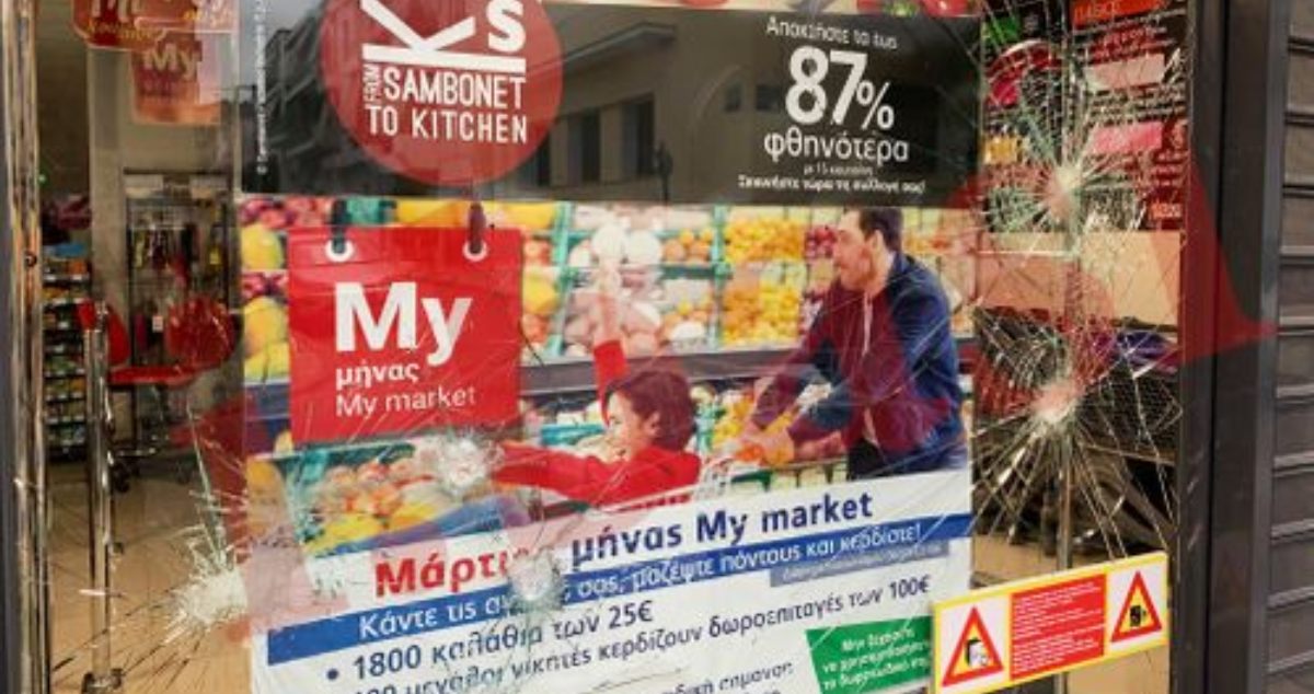 Από τις 03:00 έως τις 03:10, οι δράστες προκάλεσαν φθορές και πέταξαν μπογιές σε δεκατρία σούπερ μάρκετ, σύμφωνα με το newpost.gr, απ’ όπου και η φωτογραφία.