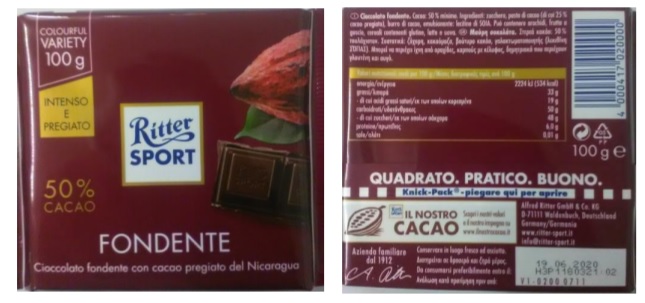 Πρόκειται για το προϊόν «Ritter SPORT FONDENTE 50%» σε συσκευασία 100 γρ., με ημερομηνία ελάχιστης διατηρησιμότητας 19/06/2020 και αριθμό παρτίδας Η3Ρ1180321, το οποίο παρασκευάζεται στη Γερμανία.