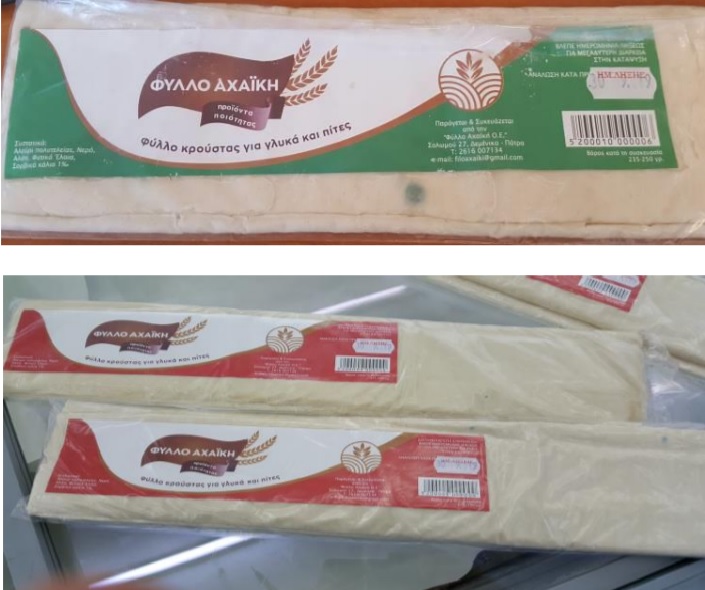 Πρόκειται για το προϊόν “ΦΥΛΛΟ ΑΧΑΪΚΗ – Φύλλο Κρούστας για Γλυκά και Πίτες”, σε συσκευασία των 250 γρ. και 500γρ. με ημερομηνία λήξης 30/9/19. Το προϊόν παράγεται από την εταιρεία ΦΥΛΛΟ ΑΧΑΪΚΗ ΟΕ με έδρα στην Πάτρα.