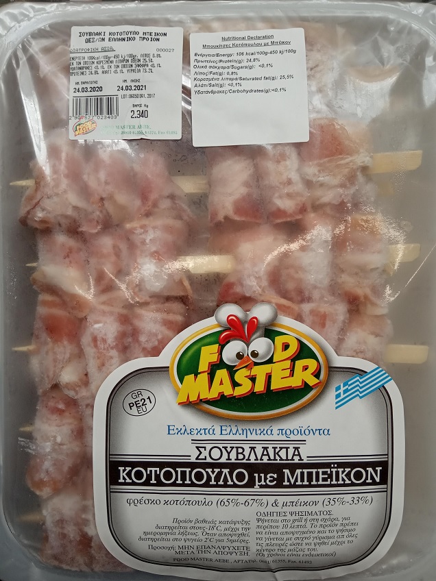 Ο Ε.Φ.Ε.Τ. και ειδικότερα η Περιφερειακή Διεύθυνση Ηπείρου, κατά τη διενέργεια ελέγχων στο πλαίσιο του Προγράμματος«Επίσημος Έλεγχος Μικροβιολογικών Κριτηρίων Ασφάλειας Τροφίμων» έτους 2020, προέβη σε δειγματοληψία από υποκατάστημα (The Mart) της εταιρείας ΜΑΡΤ ΚΑΣ & ΚΑΡΥ ΑΕ στα Ιωάννινα κατεψυγμένου παρασκευάσματος από κρέας πουλερικών που προορίζεται να καταναλωθεί μαγειρεμένο, με την εμπορική ονομασία “ΣΟΥΒΛΑΚΙΑ ΚΟΤΟΠΟΥΛΟ ΜΕ ΜΠΕΪΚΟΝ” με αριθμό Lot 06050 DQ1.2017, ημερομηνία παραγωγής 24/03/2020 και ημερομηνία λήξης 24/03/2021, το οποίο παράγεται και συσκευάζεται στην Ελλάδα από την εταιρεία Foodmaster ΑΕΒΕ.