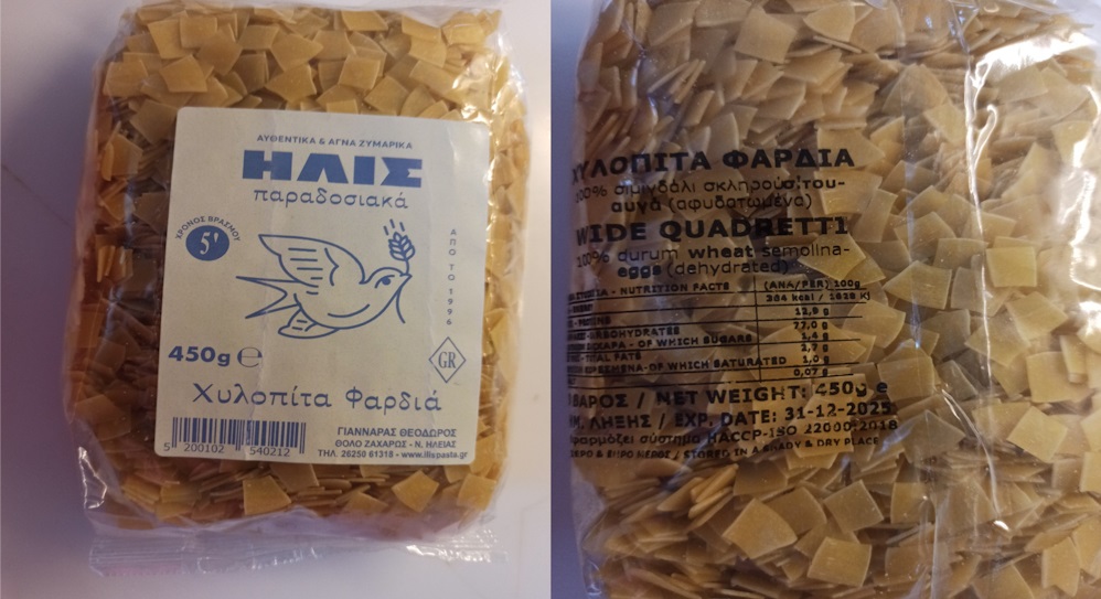 Ο Ε.Φ.Ε.Τ. και ειδικότερα η Περιφερειακή Διεύθυνση Δυτικής Ελλάδας του Ε.Φ.Ε.Τ., κατά τη διενέργεια επιθεώρησης – διερεύνησης, σχετικά με το τρόφιμο «ΗΛΙΣ Χυλοπίτα Φαρδιά» των 450 gr, το οποίο παράγεται και διακινείται από την επιχείρηση «ΓΙΑΝΝΑΡΑΣ Ι. ΘΕΟΔΩΡΟΣ» στο Θολό Ταξιαρχών στη Ζαχάρω Ηλείας, διαπίστωσε ότι στο πλαίσιο αυτοελέγχου της επιχείρησης, βρέθηκαν ίχνη γάλακτος στο συγκεκριμένο προϊόν, με αριθμό παρτίδας Lot 3902 και ημερομηνία λήξης 31-12-2025 λόγω επιμόλυνσης, χωρίς το ενδεχόμενο αυτό να αναγράφεται στα συστατικά του με τον κατάλληλο τρόπο.