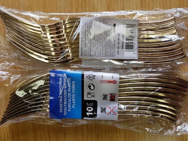 Πρόκειται για πλαστικά πιρούνια χρυσού χρώματος, προέλευσης Κίνας, σε συσκευασία των 10 τεμαχίων έκαστη, με κωδικό είδους (Item No) CC-01F, με αριθμό παρτίδας (Lot No) AZ-161224 και αριθμό γραμμοκώδικα (barcode) 0473858000032. Το εν λόγω προϊόν διακινήθηκε στην Ελλάδα από την επιχείρηση JUMBO Α.Ε.Ε..