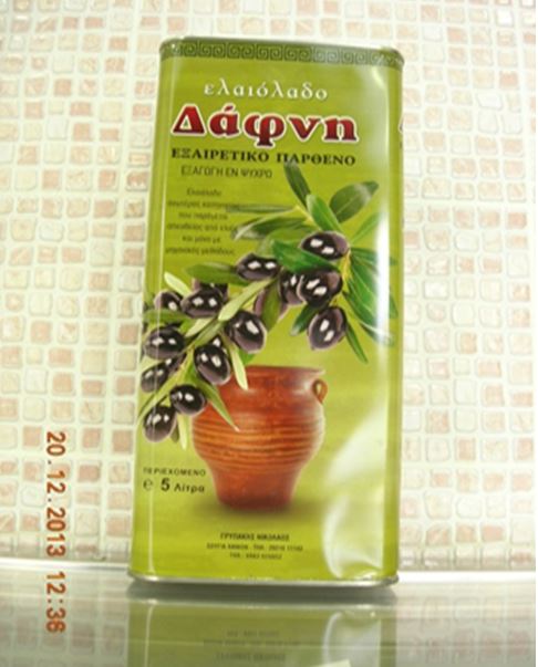 Προϊόν με την εμπορική επωνυμία «ΔΑΦΝΗ», σε συσκευασία των 5 L και ημερομηνία λήξης 31-12-2015, το οποίο επιπλέον φέρει τις ενδείξεις «ΓΡΥΠΑΚΗΣ ΝΙΚΟΛΑΟΣ – ΣΟΥΓΙΑ ΧΑΝΙΩΝ».