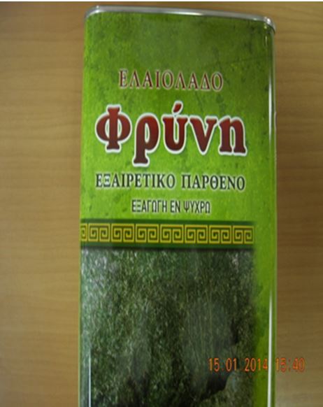 Προϊόν με την εμπορική επωνυμία «ΦΡΥΝΗ», σε συσκευασία των 5 L και ημερομηνία λήξης 31-12-2015, το οποίο επιπλέον φέρει τις ενδείξεις «ΚΟΝΤΟΓΙΩΡΓΗΣ ΑΝΤΩΝΗΣ – ΣΟΥΓΙΑ ΧΑΝΙΩΝ».