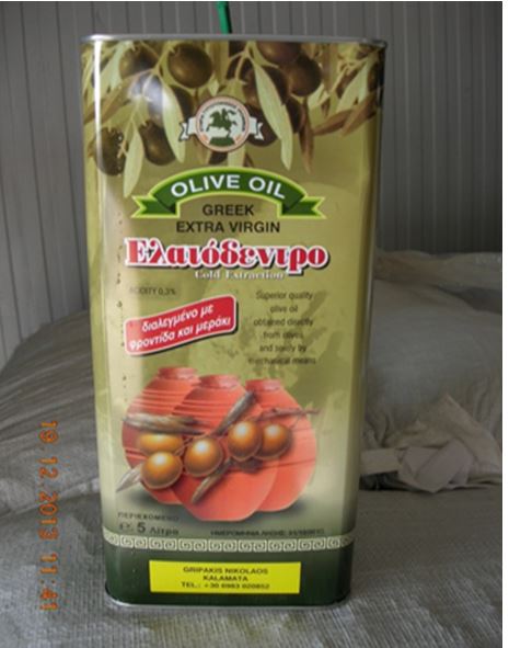 Προϊόν με την εμπορική επωνυμία «ΕΛΑΙΟΔΕΝΤΡΟ», σε συσκευασία των 5 L και ημερομηνία λήξης 31-12-2015, το οποίο επιπλέον φέρει τις ενδείξεις «ΓΡΥΠΑΚΗΣ ΝΙΚΟΛΑΟΣ – ΚΑΛΑΜΑΤΑ».