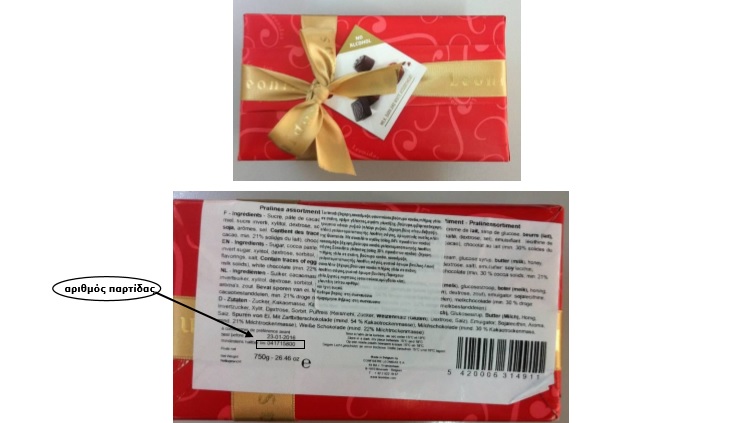 Πρόκειται για τα προϊόντα με εμπορική ονομασία “Leonidas Ballotin rouge mix”, σε συσκευασία των 750g, με αριθμούς παρτίδας 041715800 και 040315800, τα οποία παρασκευάστηκαν από την Βελγική εταιρεία “Confiserie Léonidas SA” και διακινήθηκαν στα Καταστήματα Αφορολόγητων Ειδών του Διεθνούς Αερολιμένα Αθηνών “Ελευθέριος Βενιζέλος” (Σπάτα).