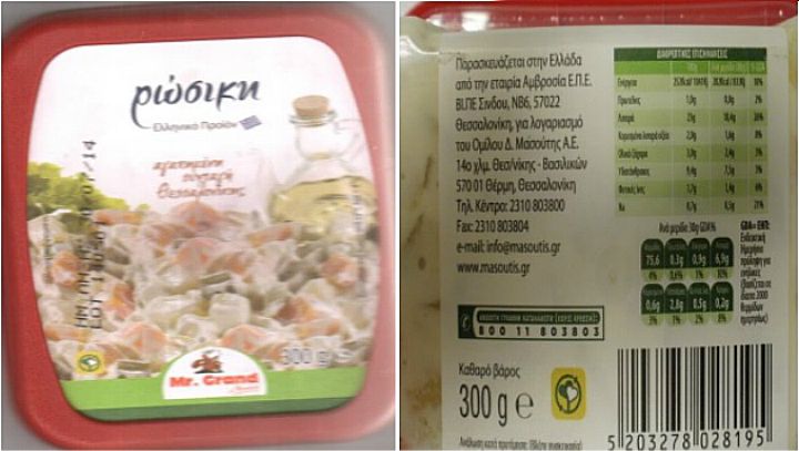 Πρόκειται για το προϊόν «Ρώσικη σαλάτα» Μr GRAND, σε συσκευασία των 300 γραμμαρίων, με Lot number 140501 και ημερομηνία λήξης 30/7/2014, που παράγεται από την εταιρεία ΑΜΒΡΟΣΙΑ ΕΠΕ, ΣΙΝΔΟΥ ΝΒ6 57022, ΘΕΣΣΑΛΟΝΙΚΗ για λογαριασμό του ομίλου Δ. Μασούτης Α.Ε. και το οποίο κρίθηκε ΜΗ ΑΣΦΑΛΕΣ. Ο Ε.Φ.Ε.Τ. απαίτησε την άμεση ανάκληση – απόσυρση του συνόλου της εν λόγω παρτίδας προϊόντος από την επιχείρηση και ήδη βρίσκονται σε εξέλιξη οι σχετικοί έλεγχοι. Ο Ε.Φ.Ε.Τ. συνιστά στους καταναλωτές, στην περίπτωση που διαπιστώσουν την παρουσία μυκήτων (μούχλα), να μην καταναλώσουν το προϊόν της φωτογραφίας.
