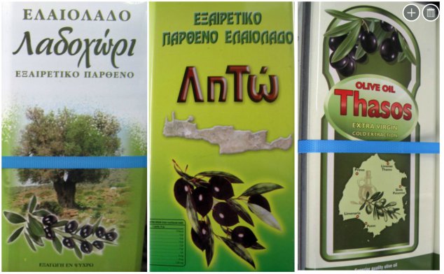 – δεξαμενών για αποθήκευση ελαίων – εξοπλισμός για χειροκίνητη συσκευασία ελαίων – δελτία αποστολής και τιμολόγια αγοράς σογιέλαιου, χρωστικών και κενών λιθογραφημένων δοχείων – συσκευασίες με χρωστικές – κενά και γεμάτα λιθογραφημένα δοχεία ελαιολάδου 5 λίτρων. Τα δοχεία αυτά έφεραν ενδείξεις «ελαιόλαδο» ή «εξαιρετικό παρθένο ελαιόλαδο» με σήματα τα οποία, αρκετά από αυτά, στο παρελθόν έχουν διαπιστωθεί πως αφορούν σε προϊόντα νοθευμένα είτε και επιβλαβή για την υγεία. Ειδικότερα, πρόκειται για τις εμπορικές επωνυμίες «ΑΓΝΑΝΤΙ», «ΠΑΡΝΩΝΑΣ», «ΛΗΤΩ», «ΔΑΦΝΗ», «ΘΑΣΟΣ», «ΓΕΥΣΗ», «OIL», «ΑΜΒΡΟΣΙΑ», «ΑΣΤΡΟΝ», «ΔΗΜΗΤΡΑ», «ΔΙΩΝΗ», «ΕΛΑΙΟΜΥΛΟΣ», «ΛΑΔΟΧΩΡΙ», «ΛΙΟΚΛΑΔΟ», «CRETA» και «MAZOCHTO».