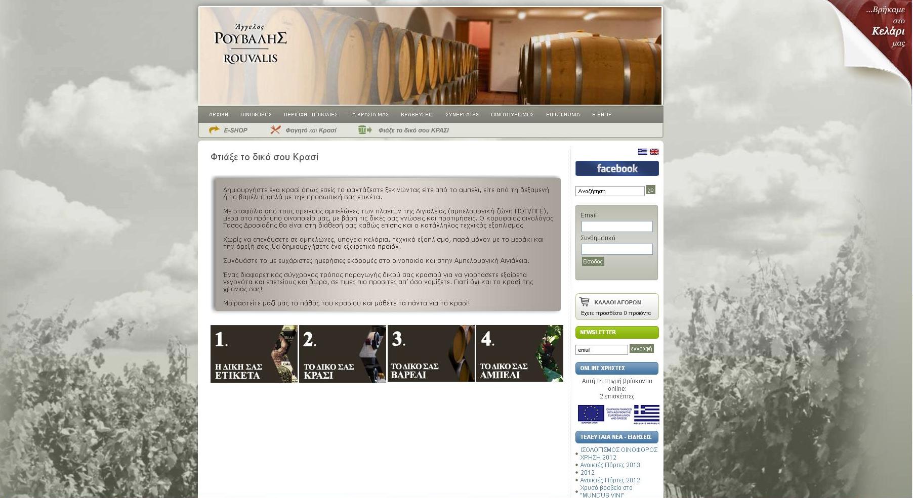 Πώς θα σας φαινόταν η ιδέα να απολαμβάνετε το δικό σας κρασί, τον δικό σας συνδυασμό ποικιλιών με την καθοδήγηση έμπειρων οινολόγων; Στο ανανεωμένο ηλεκτρονικό κατάστημα www.rouvaliswinery.gr του οινοτέχνη Άγγελου Ρούβαλη έχετε τη δυνατότητα να παράγετε το δικό σας κρασί ξεκινώντας είτε από το αμπέλι, είτε τη δεξαμενή ή το βαρέλι. Ακόμη, μπορείτε να επιλέξετε το κρασί από τις ποικιλίες που οινοποιούνται και να δημιουργήσετε την προσωπική σας ετικέτα.
