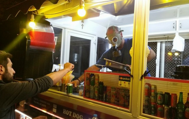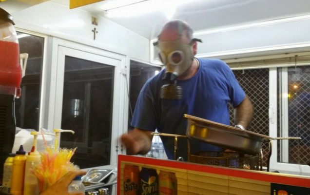 Τα δακρυγόνα και τα χημικά που έπεσαν κατά τη διάρκεια των επεισοδίων, με αφορμή τη συγκεκριμένη συζήτηση του ΣΥΡΙΖΑ, υποχρέωσαν τον άνδρα να φορέσει αντιασφυξιογόνα μάσκα, προκειμένου να καταφέρει να συνεχίσει να σερβίρει τους πελάτες του.