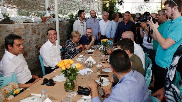 Ο πρωθυπουργός εμφανίστηκε αδυνατισμένος από το «τρέξιμο» των εκλογών με χαλαρή διάθεση και ανακουφισμένος που ολοκλήρωσε με επιτυχία μια δύσκολη τετραετία και μια μακρά προεκλογική περίοδο. Απόλαυσε κρύα μπίρα με ψαρομεζέδες και συζήτησε εφ΄όλης της ύλης με τους δημοσιογράφους, που καλύπτουν το ρεπορτάζ του ΣΥΡΙΖΑ.