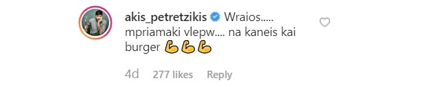 Ακολουθούν εκατοντάδες σχόλια από φίλους και φίλες του Σάκη Ρουβά μεταξύ των οποίων και του έτερου ποπ σταρ της χώρας που διαπρέπει όχι στη μουσική αλλά στη μαγειρική σκηνή: του επίσης πολυαγαπημένου του κοινού Άκη Πετρετζίκη. Σχολιάζει ο Άκης: «Ωραίος… μπριαμάκι βλέπω… να κάνεις και μπέργκερ». Και ρίχνει και μερικά …μπρατσάκια προς ενθάρρυνση του μάγειρα.