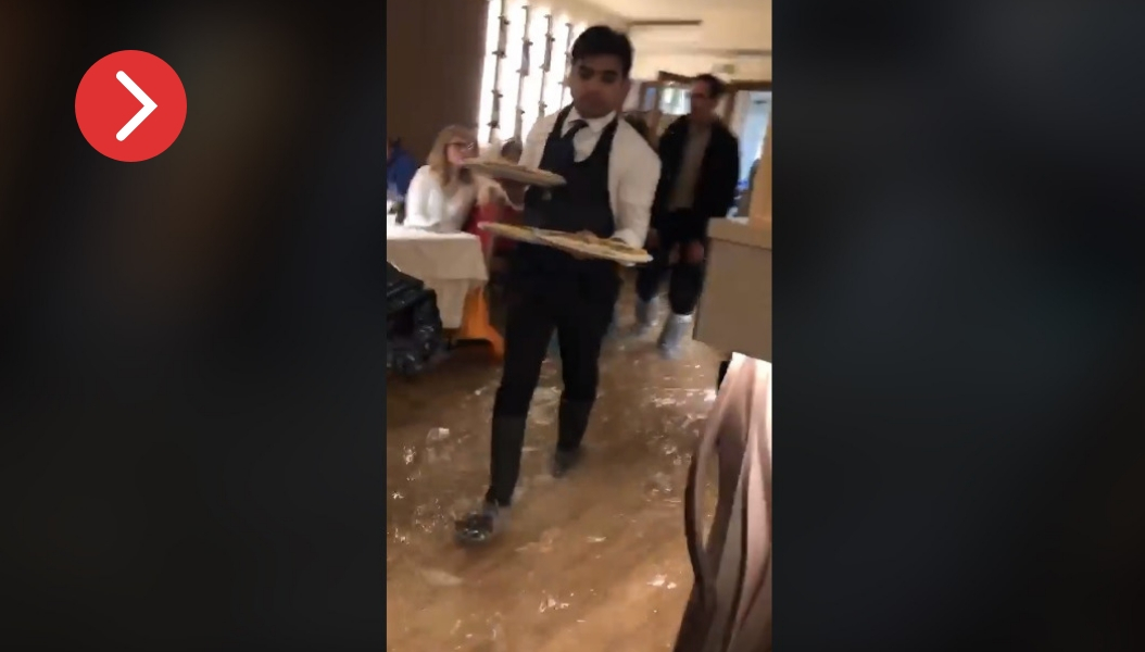 Η σφοδρή κακοκαιρία που χτύπησε την Ιταλία, κόστισε τη ζωή σε 12 πολίτες και «βύθισε» τη Βενετία έχει κάποιες πιο …ανάλαφρες στιγμές. Μια τέτοια είναι και το βίντεο που έκανε το γύρο του διαδικτύου και εμφανίζει τους τουρίστες πελάτες μιας βενετσιάνικης πιτσαρίας να απολαμβάνουν ή να περιμένουν στωικά να σερβιριστούν από τους σερβιτόρους, την ώρα που το νερό κοντεύει να τους φτάσει στο …γόνατο.