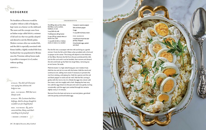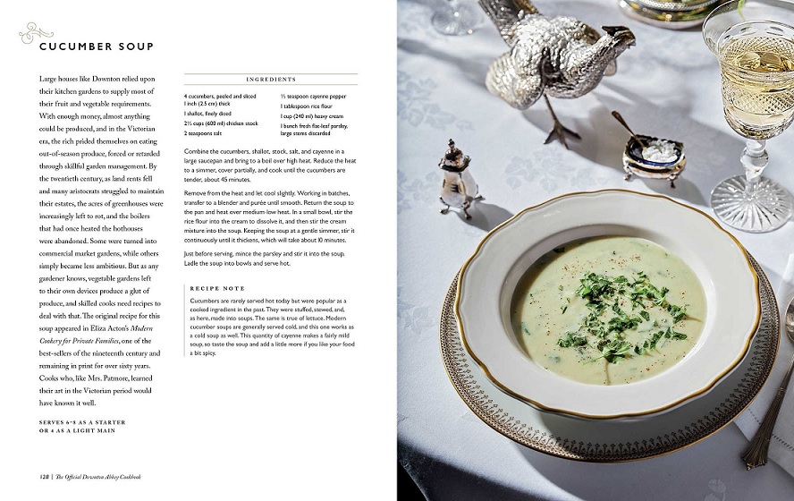 Οι συνταγές είναι προσαρμοσμένες από τις πρωτότυπες της εποχής ή αναπαράγονται όπως παρουσιάζονται στην οθόνη και, όλες αντανακλούν τις επιρροές που βρέθηκαν στα τραπέζια του Downton Abbey.