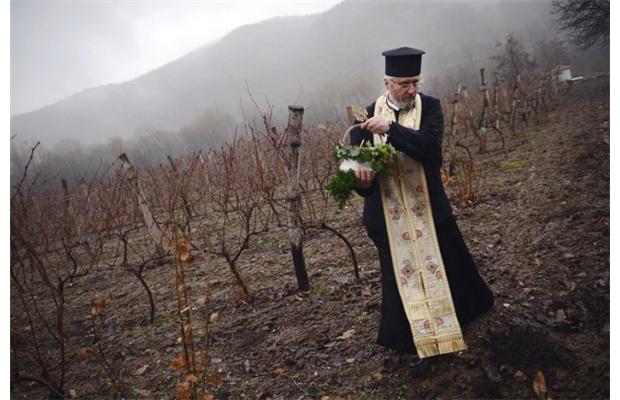 Στη φωτό, που τραβήχτηκε το Φλεβάρη, ορθόδοξος ιερέας ευλογεί τον αμπελώνα για να έχει καλή σοδειά -“καλοί οι ειδικοί απ’ το Μπορντό , αλλά να τιμάμε και την παράδοση, γιατί ποτέ δεν ξέρεις…”, πρέπει να σκέφτηκαν οι ιθύνοντες.