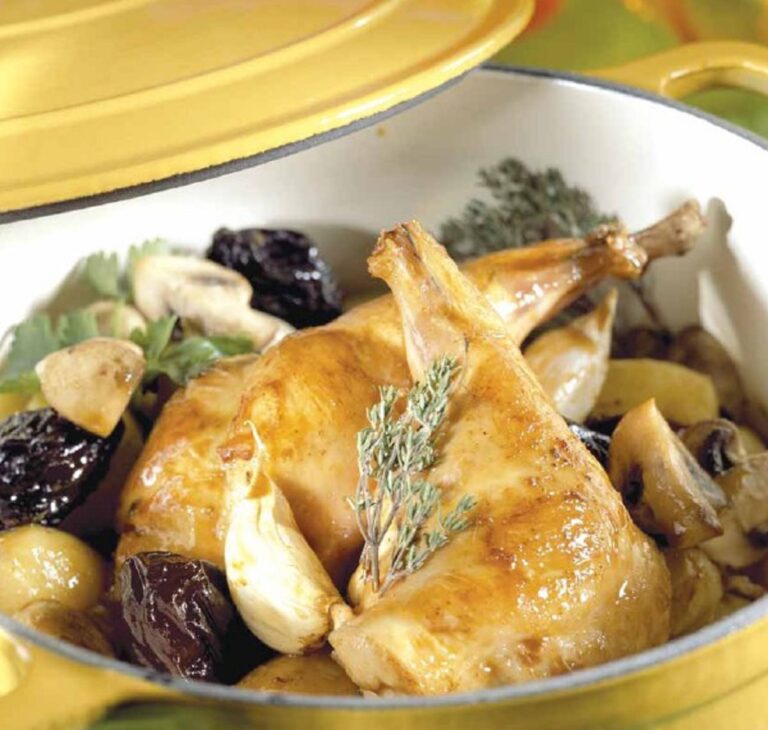 Φραγκόκοτα με δαμάσκηνα και μανιτάρια