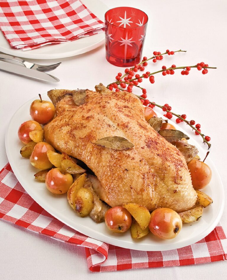 Χήνα ψητή με ζαμπόν, μήλα και δαμάσκηνα